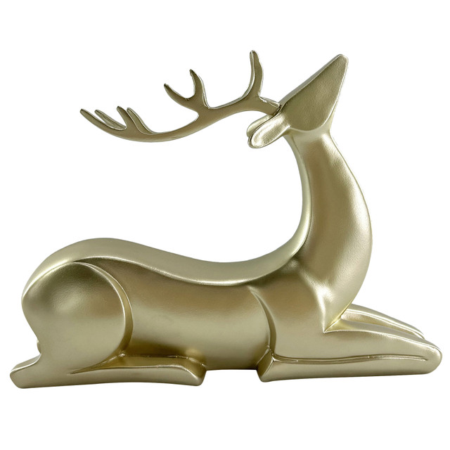 This 12 x 9-inch reindeer figurine features a sleek, modern design in a golden/champagne finish. With smooth lines and prominent antlers, it makes an elegant accent for holiday or year-round décor. Measures 12 x 9 Inches.