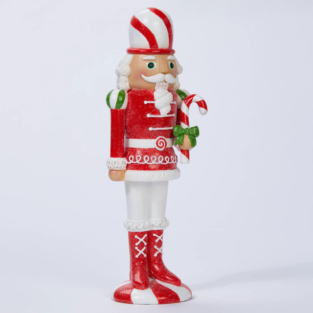 Add a playful pop to your holiday display with this charming polyresin nutcracker from the Peppermint Sticks Collection. Crafted from durable polyresin, it features a festive red and white uniform with green gemstone accents and gold detailing. Topped with a candy cane-striped hat and holding a wreath and candy cane, this whimsical figure stands proudly on a matching striped base. Perfect for tabletops, mantels, or shelvesit's a sweet seasonal statement piece. Measures:5 x 4 x 14 Inches.