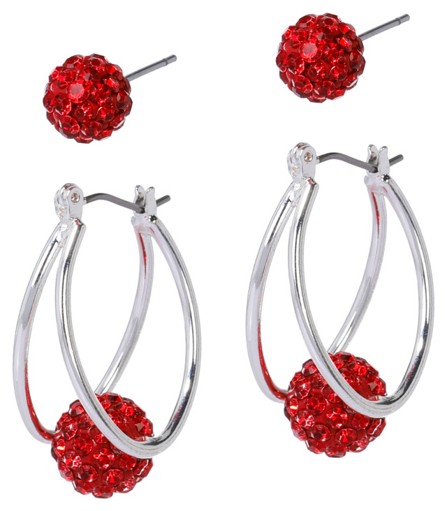 Add festive flair to your accessories with this 2 piece hoop and stud earrings. Featuring glittering red crystal designs, each pair hangs from fishhook backs for easy, comfortable wear. Perfect for seasonal outfits or gifting.