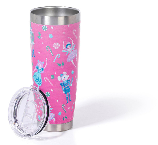 Celebrate the season with the 30 oz Stainless Steel Nutcracker Ballet Tumbler. Features a festive print of nutcrackers, ballet dancers, and candy on a muted red background, perfect for holiday sipping in style. Hand wash only. Fabrication is 100% stainless steel.