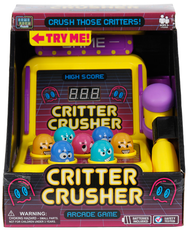Bring arcade style fun home with this Kids Game Room Arcade Critter Crusher Toy. A fast paced critter bopping game that lights up, makes sounds, and speeds up as you play. Kids can chase high scores by tapping the critters with the included mallet, making it a great choice for solo play or group fun. Requires 2 AA batteries (included). For 1 or more players. Recommended for ages 3 years and up.
