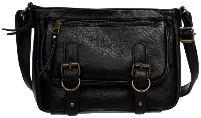This womens crossbody handbag features a buckle front and a zippered top for secure and stylish wear. The lined interior includes a slip pocket, and an adjustable strap allows comfortable hands free use, combining practicality with elegant design. Measures approximately 10 in x 7 in x 3 in, excluding straps.