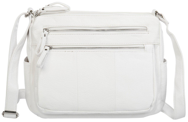This crossbody bag features a solid color design on a soft, grainy washed, leather fabrication, an adjustable crossbody strap, two front exterior zip pockets and top zip closure. The lined interior includes one zip and two slip pockets. Measures approximately 9 in x 4 in x 7 in.