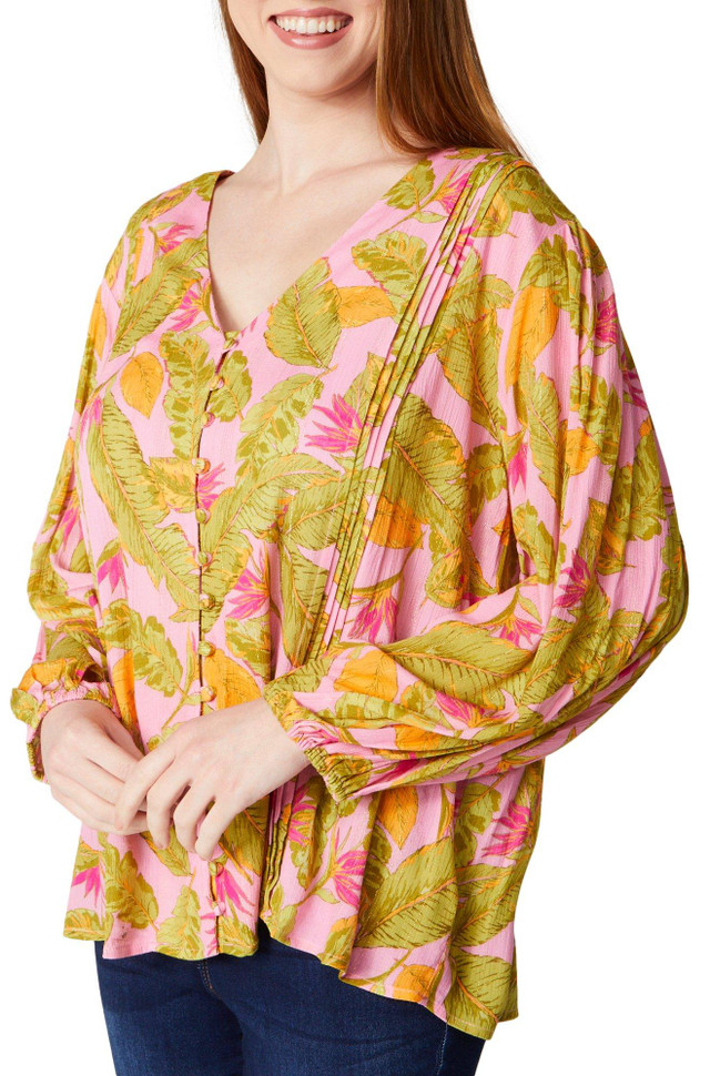 This Long Sleeve Top is a perfect blend of elegance and comfort. Featuring a buttoned front and metallic stitching, it adds a touch of sophistication to any outfit. The pleated details enhance its stylish appeal, while the elastic cuffs provide a comfortable fit. Ideal for both casual and dressy occasions, this top is a versatile addition to your wardrobe. Fabrication is 99% rayon and 1% lurex.