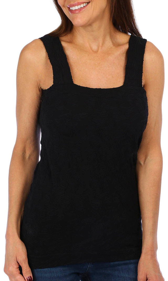 Enhance your wardrobe with our Textured Sleeveless Top. Featuring fixed straps for a secure fit, this top showcases a beautiful textured embroidered design that adds a touch of elegance. The solid color makes it easy to pair with any outfit, whether youre dressing up for a special occasion or keeping it casual. Perfect for warm weather, this versatile top combines style and comfort effortlessly. The top length measures approximately 25 in. Fabrication is 92% nylon and 8% spandex.