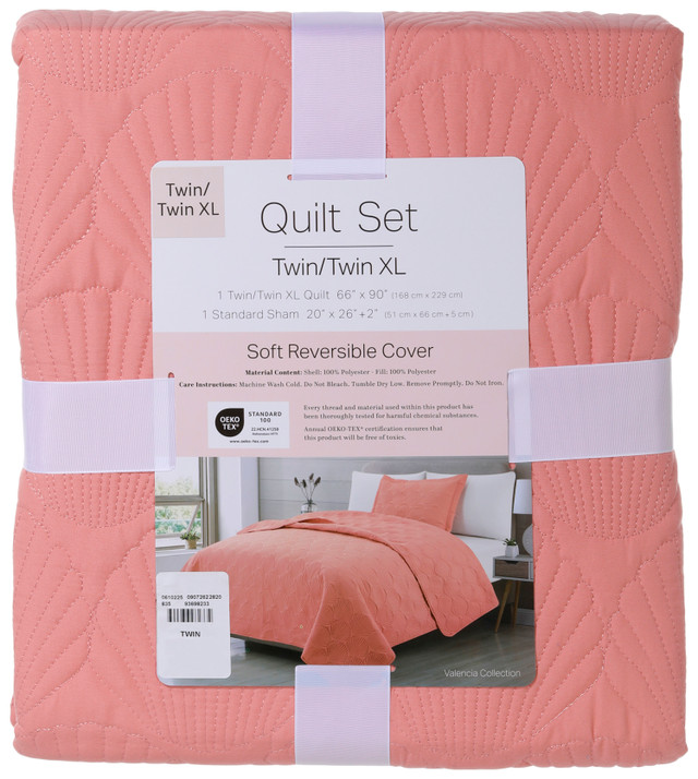 Bring coastal charm to your bedroom with the Valencia Coral Quilt Set featuring an embroidered shell design. King and Queen sets include 1 quilt and 2 pillow shams; Twin/Twin XL includes 1 quilt and 1 sham. Perfect for lightweight comfort and tropical style. Fabrication 100% polyester