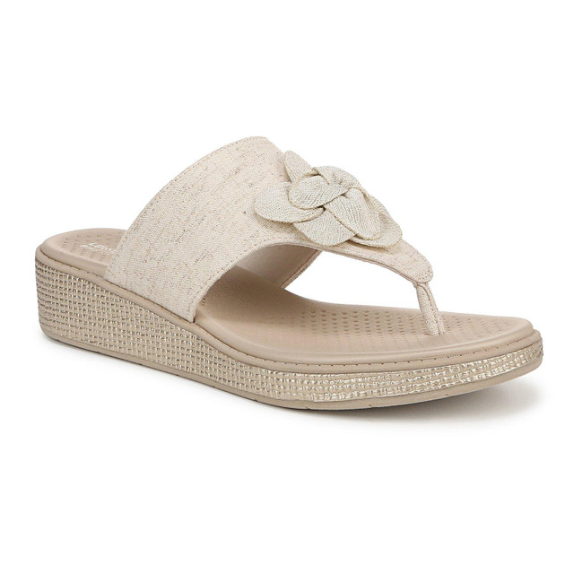Sandals that let your style flourish! Step into the comfort of the Bloom sandal. It features a stretch linen upper with partially recycled linings and a round toe, a decorative flower, BZEES Air Step Technology for a weightless feel, dynamic stretch fabric with built-in stretch, FreeFoam Comfort insoles with maximum foot contact and cushy arch support. Includes anti-microbial and odor control technology. Heel height 1.5 in. Machine Washable.