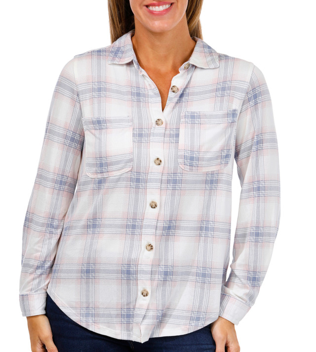 Stay effortlessly casual in the Womens Long Sleeve Button Down Plaid Top. Made from soft, comfortable fabric, this classic plaid shirt features long sleeves, chest pockets, and a relaxed fit for easy everyday wear. Perfect for layering over a tee or pairing with jeans for a laid back look. Fabrication is 95% polyester, 5% spandex. Length measures approximately 26 in.