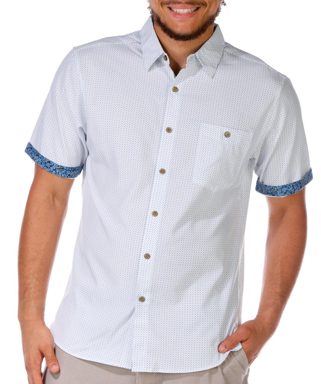 This woven short sleeve shirt features a buttoned front, chest pocket, and a sharp micro print. Designed with cooling technology, stretch fabric, and a wrinkle free finish, it delivers all day comfort with a polished look. Fabrication is 92% polyester, 8% spandex.