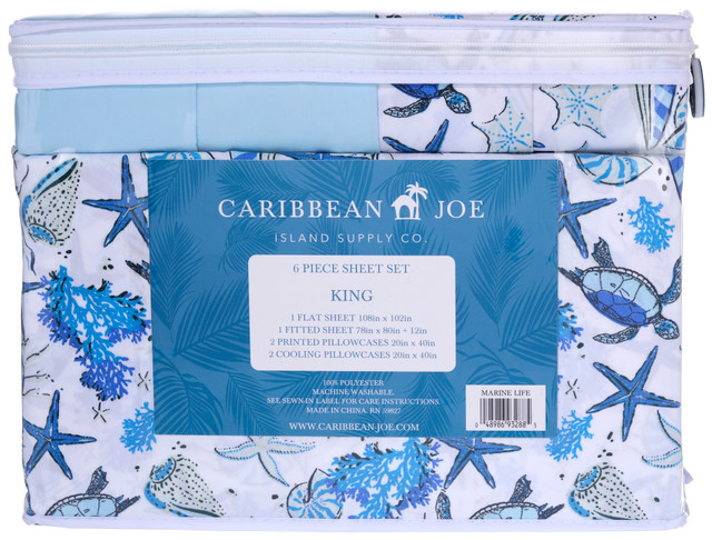 Drift into comfort with this 6-piece Cooling Marine Life Sheet Set, featuring a playful sea animal print. The set includes 1 flat sheet, 1 fitted sheet, 2 printed pillowcases, and 2 cooling pillowcases.