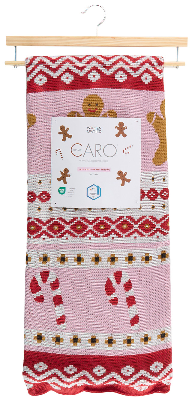 Add a sweet touch of holiday cheer with this festive knitted throw, featuring a playful pink and red gingerbread-inspired design. Decorated with charming gingerbread men, candy canes, and classic seasonal motifs, it brings cozy Christmas warmth to any space. Made from soft, durable poly knit and fully machine washable for effortless care. Measures approximately 50 in x 60 in.