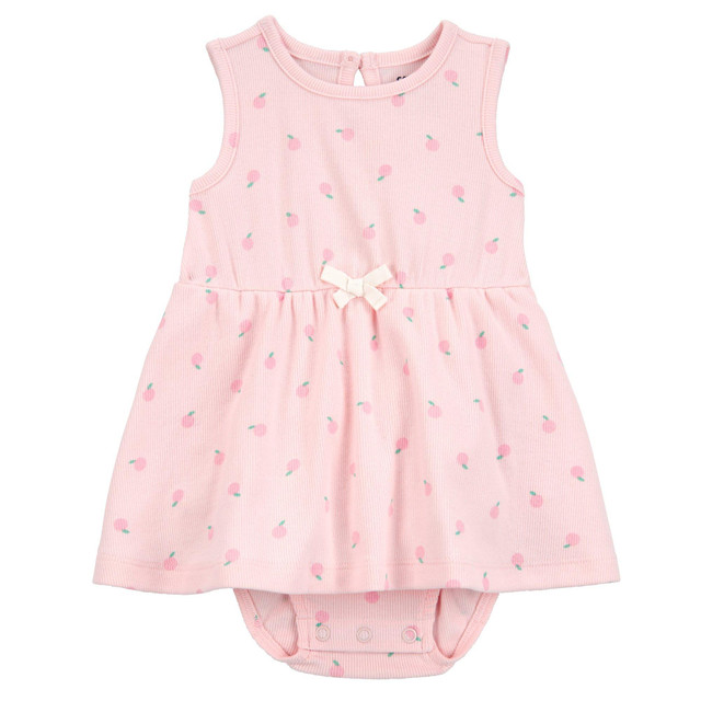 Carters offers cute and comfortable clothing with soft, durable fabrics for your little one! Looks like a dress but built like a bodysuit, what could be better? Complete with allover peaches and easy snaps at the legs for quick changes, this sunsuit gets baby ready in no time!