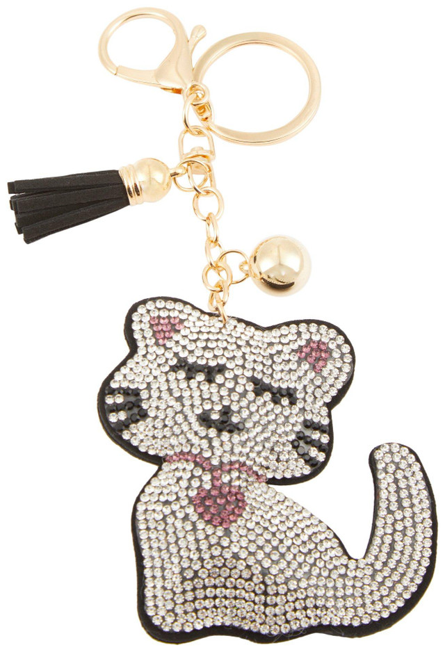 Add a touch of charm with the Cat Bag Charm. Featuring a sparkling rhinestone exterior and a sleek gold lobster clasp, this 3-inch accessory is a stylish and whimsical way to personalize your bag or keychain.