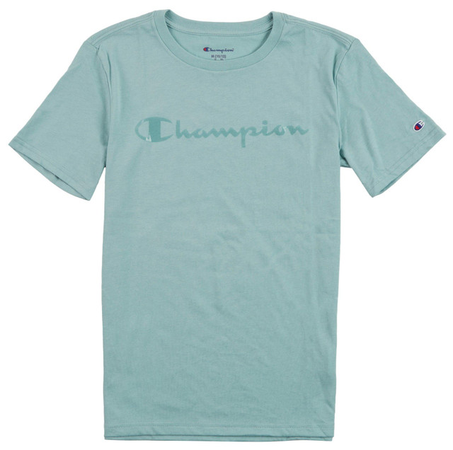 This Champion boys' T-shirt features a classic crew neck design with a bold logo screen print on the chest. Made from a soft cotton-polyester blend, it offers comfort and durability for everyday wear. With short sleeves and a relaxed fit, it's perfect for active play or casual outings.