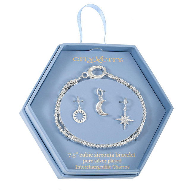 The City By City Moon & Stars Charm Chain Link Bracelet is a celestial-inspired piece that captures the magic of the night sky. Adorned with delicate charms of the moon and stars, this bracelet adds a touch of whimsy and elegance to any look. Its adjustable chain link design ensures a perfect fit, making it a charming accessory for dreamers and stargazers alike.