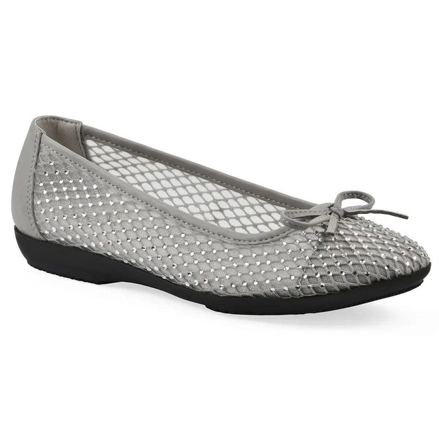 . Featuring a hint of sparkle and a delicate bow detail, this flat is designed to elevate your wardrobe without sacrificing comfort. A cushioned insole ensures all-day comfort, while the subtle embellishments add the perfect touch of flair.