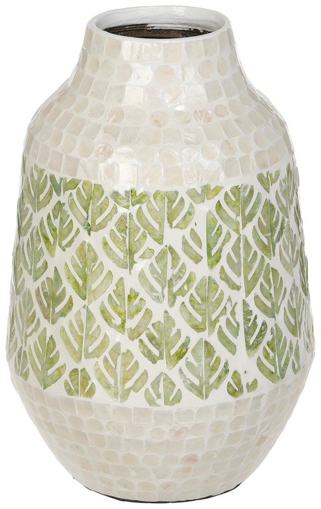 Introducing the 14-inch Capiz Shell Leaf Vase, a captivating addition to your home décor. This exquisite vase features a delicate leaf design crafted from shimmering capiz shells, creating a stunning visual effect. Measuring 14 inches in height, it is perfect for showcasing floral arrangements or standing alone as a decorative piece. The natural iridescence of the capiz shells adds a touch of elegance and sophistication, making this vase a beautiful focal point in any room.