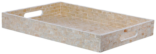 Elevate your entertaining experience with this stunning Capiz Shell Serving Tray, featuring double handles. This exquisite tray showcases the natural beauty of capiz shells, meticulously arranged to create a shimmering, iridescent surface that catches the light beautifully. The sturdy double handles ensure easy carrying, making it perfect for serving drinks, appetizers, or desserts with a touch of coastal sophistication. Measures approximately 16 in x 12 in x 2 in.