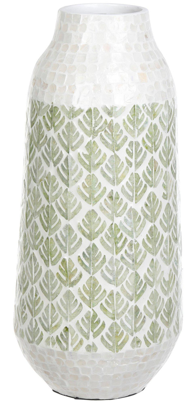 Enhance your home decor with this exquisite 22 in Leaf Capiz Shell Vase. Crafted with meticulous attention to detail, this vase features a stunning mosaic of natural capiz shells, creating a shimmering effect that catches the light beautifully. Its vibrant hues add a touch of elegance and sophistication to any room. Perfect for displaying fresh flowers or as a standalone statement piece, this vase is a versatile and stylish addition to your home. Measures approximately 22 in x 10 in.