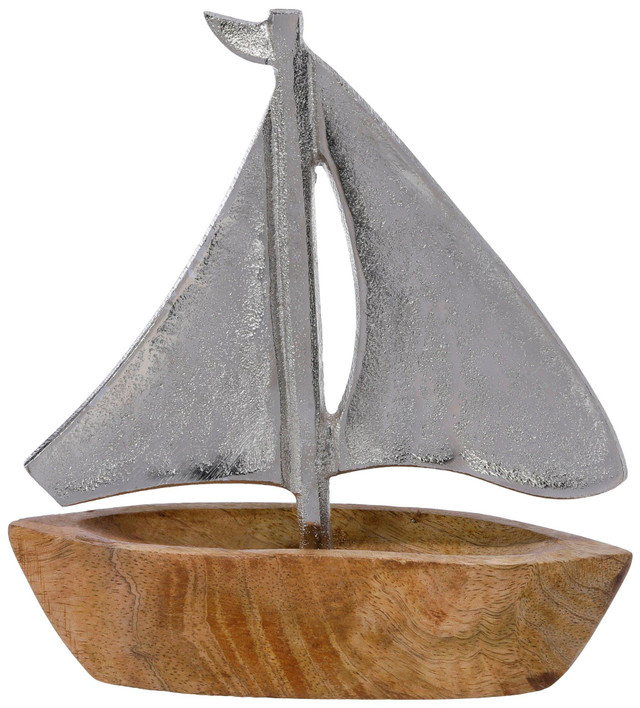 Bring the spirit of the sea into your home with the Wooden and Metal Sailboat Decor. This beautifully crafted piece combines natural wood and sleek metal to create a stunning sailboat design. The intricate details and contrasting materials add a touch of nautical elegance to any room. Measures approximately 2 in x 6.5 in x 7 in.