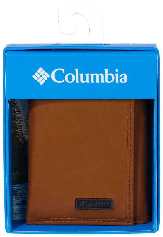 This Mens Harney Trifold Wallet features a solid color design with heavy edge stitching on grainy leather, a trifold silhouette, a front embossed brand, slim profile, and RFID-blocking technology to help protect personal information from identity theft. Contains one ID window, 6 interior credit card slots, 2 slip pockets, and a currency compartment. Dimensions: 4.25 inches x 4.5 inches.