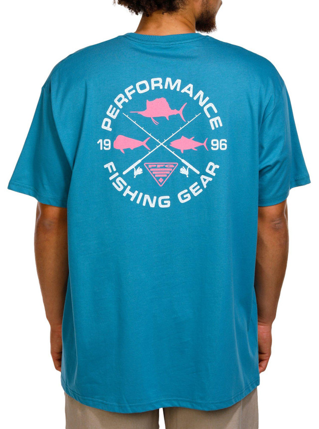 Keep each adventure going strong with this PFG T-shirt by Columbia. This short sleeve tee is perfect for fishermen on & off the water and features breathable 100% cotton fabric, a sailboat and fish design on the back, a Columbia PFG logo on the chest, and a flexible crew neckline for all-day comfort. Measures approximately 29 inches in length.