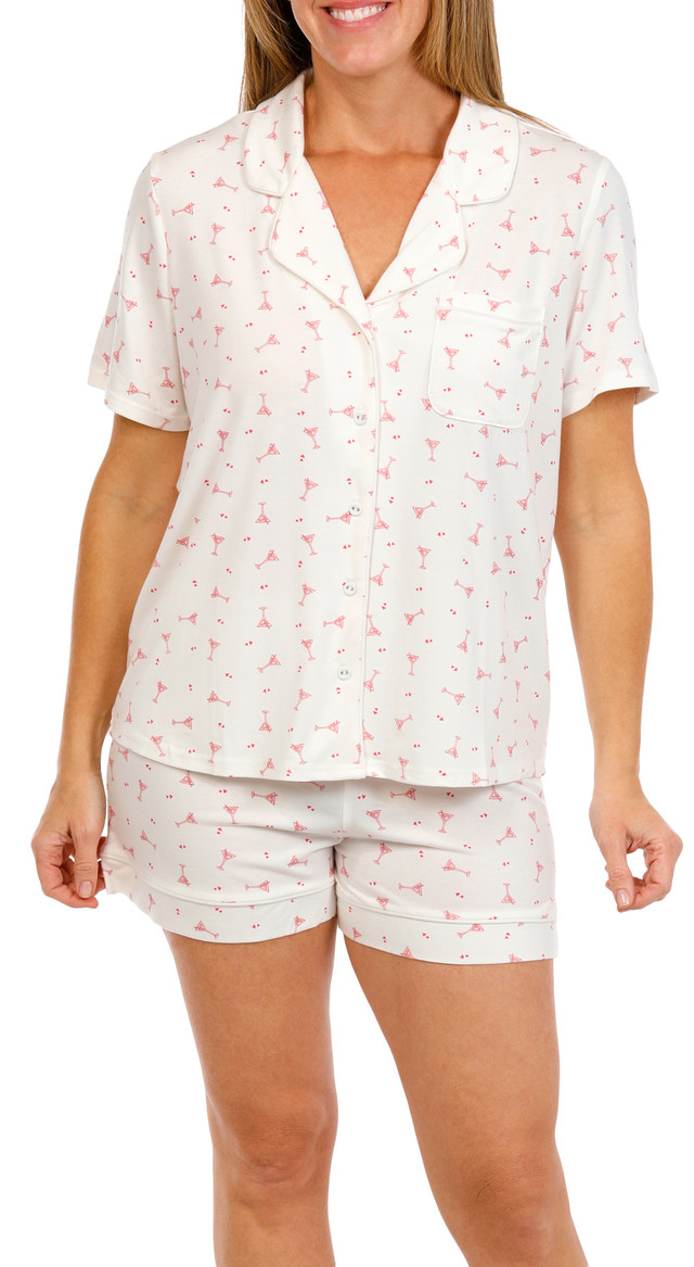This womens pajama set features a playful martini and heart print crafted from a soft modal blend for comfortable rest. The short sleeve top includes a notch collar, button down front, and chest pockets, while the matching shorts feature an elastic waist for an easy fit, making this set ideal for lounging or sleeping. Top length measures approximately 25 in. Shorts inseam is approximately 3 in. Fabrication is 50% modal, 42% polyester, and 8% spandex.