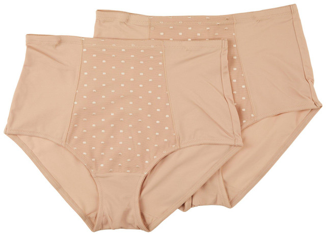 Introducing our Women's 2 Pack Perfect Shape Briefs, crafted from a comfortable blend of nylon and spandex. These briefs feature a stylish solid exterior with a dotted mesh panel on the front for added flair. Designed with a tummy smoothing feature and full coverage, they offer both support and style. Perfect for everyday wear, these briefs combine comfort, functionality, and a touch of elegance. Style 75404P2.