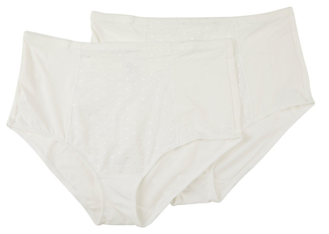 Introducing our Women's 2 Pack Perfect Shape Briefs, crafted from a comfortable blend of nylon and spandex. These briefs feature a stylish solid exterior with a dotted mesh panel on the front for added flair. Designed with a tummy smoothing feature and full coverage, they offer both support and style. Perfect for everyday wear, these briefs combine comfort, functionality, and a touch of elegance. Style 75404P2.