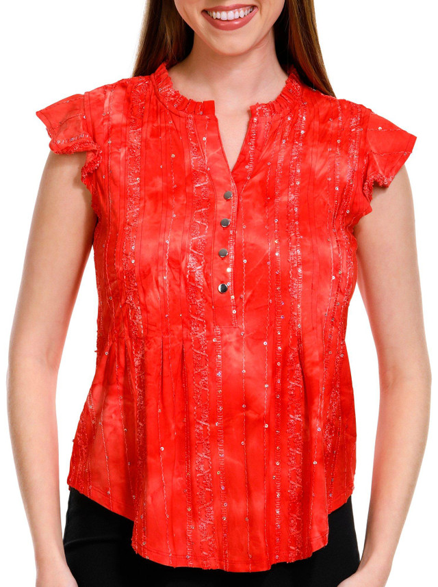 Make a statement with our tie-dye design cap sleeve top. Crafted from lightweight stretch fabric, this chic piece features a split neckline with a 4-button placket. The embellished details add a touch of elegance to this classic-styled top. The top length measures approximately 24 in. Fabrication 95% polyester, 5% spandex.