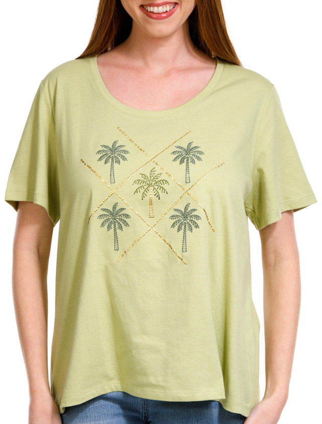 The Short Sleeve Top is a chic and comfortable addition to your wardrobe. Made from a soft 60% cotton and 40% polyester blend, it offers breathability and comfort with just the right amount of stretch. The scoop neckline adds a flattering touch, while the embellished details enhance its stylish look. With a 25-inch length, this petite top is perfect for casual or semi-formal occasions.