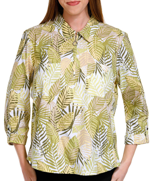 Add some flair to your wardrobe with this Petite Printed Zip Front 3/4 Sleeve Top! Featuring a chic 1/4 zip-up collared neckline, a vibrant palm leaf print, and functional chest slip pockets, its perfect for both style and convenience. Made from 67% cotton, 29% polyester, and 4% spandex, it offers a comfortable, stretchy fit that's perfect for everyday wear.