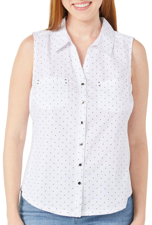 Effortlessly chic, this Petite Sleeveless Polka Dot Button Down Top features a classic collared neckline, playful polka dot print, front button closure, and handy chest slip pockets. Fabrication is 67% cotton, 29% polyester, and 4% spandex.