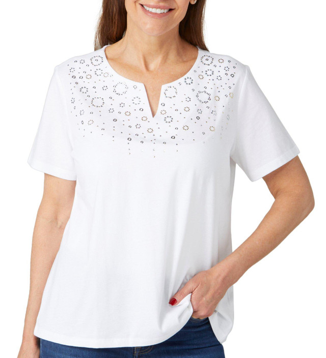Introducing the Petite Split Neck Spring Bubble Top, crafted from a comfortable blend of cotton and polyester. This stylish solid-color top features an embellished collar and a flattering split neckline. With short sleeves and a 24-inch length, it offers a chic and elegant look perfect for any occasion. Combining fashion and comfort, this top ensures you stay stylish and confident throughout your day.