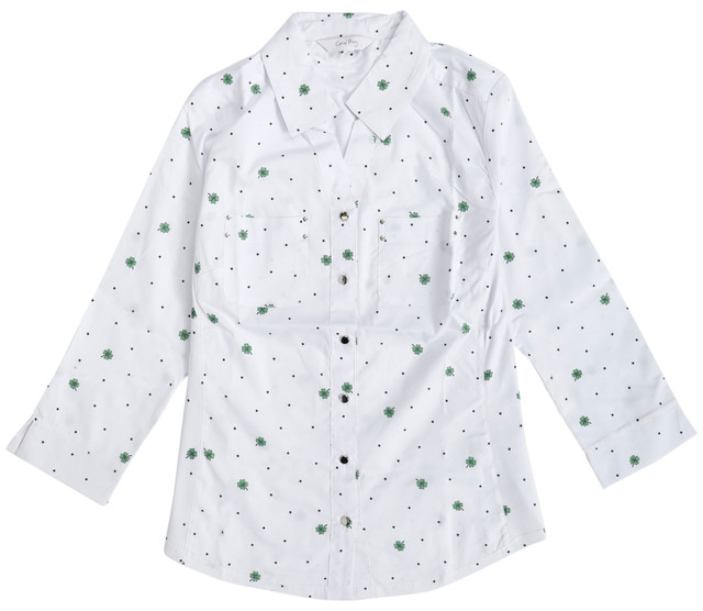 This plus 3/4 sleeve shamrock button down top features chest pockets and a festive shamrock print perfect for celebrating the season. The relaxed fit and soft fabric offer everyday comfort while the button down style adds classic charm. A cheerful piece for effortless holiday style. Top length measures approximately 28 inches. Fabrication is 67% cotton, 29% polyester, and 4% spandex.
