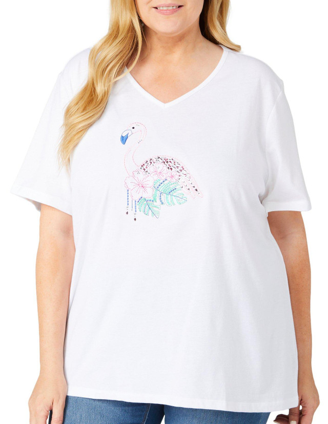 Brighten up your wardrobe with the Plus Embellished Flamingo Short Sleeve Top! Crafted from a soft and durable blend of 60% cotton and 40% polyester, this top offers a perfect balance of comfort and style. Measuring 25 inches in length, it provides a flattering fit that's easy to pair with your favorite bottoms. The delightful embellished flamingo design adds a playful and unique touch, making it a charming choice for casual outings or relaxed gatherings.