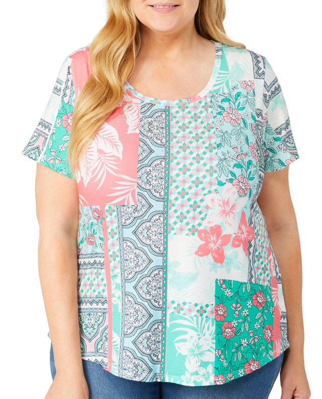 This womens embellished mixed print top is made from a soft blend of 95% polyester and 5% spandex, providing a comfortable, stretchy fit. Featuring a unique mix of prints, the top is accented with sparkling embellishments for added flair. Ideal for pairing with jeans or skirts, it offers a chic, casual look with a touch of elegance.