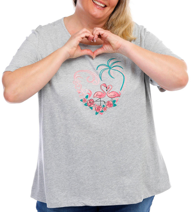 Introducing the Plus Flamingo Rose Heart Crew Neck Top, where delightful design meets everyday comfort. Crafted from a soft and durable blend of 60% cotton and 40% polyester, this top ensures breathability and all-day comfort. The classic crew neck and short sleeves provide a relaxed yet stylish fit, making it perfect for any casual occasion. Adorned with charming flamingo and rose heart embellishments, this top adds a touch of playful elegance to your wardrobe.