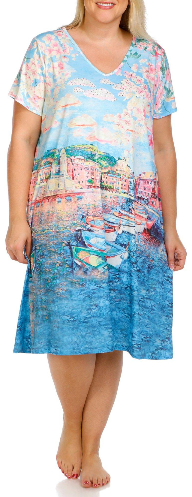 This plus size swing dress features short sleeves, a v-neckline, and a coastal inspired graphic with rhinestone accents. Made from soft fabric, it is perfect for lounging, sleepwear, or casual days with a relaxed and breezy fit. Fabrication 95% polyester, 5% spandex