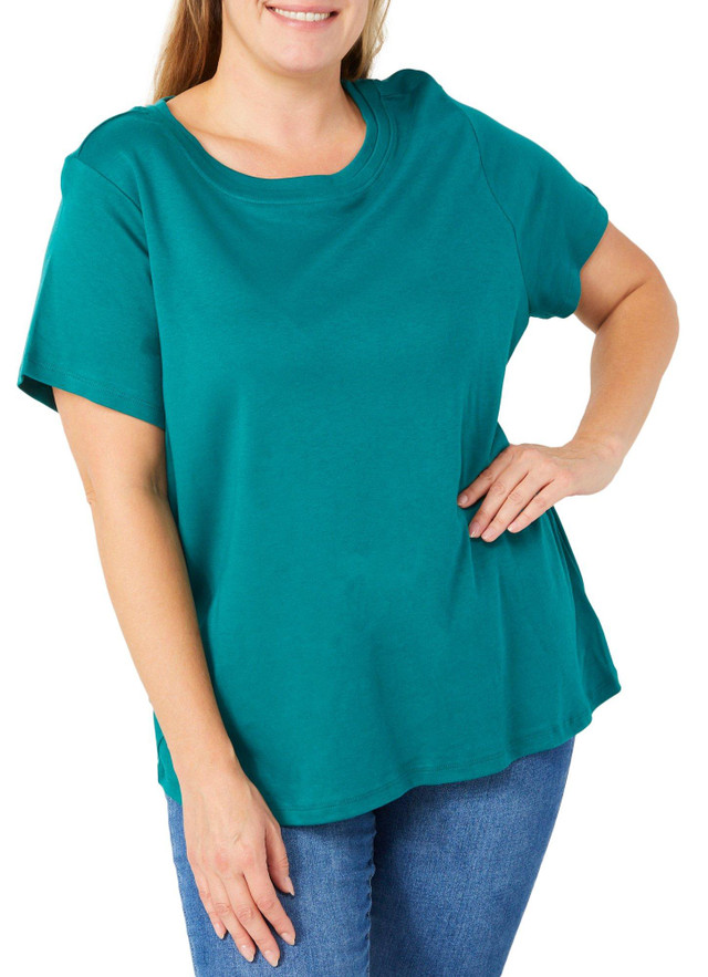Keep it sleek and stylish with this Plus Double Band Scoop Neck Top. Featuring short sleeves and a flattering scoop neckline with double band detailing, this solid-colored essential adds a modern twist to your everyday wardrobe. Fabrication is 100% cotton. Measures approximately 30 inches.
