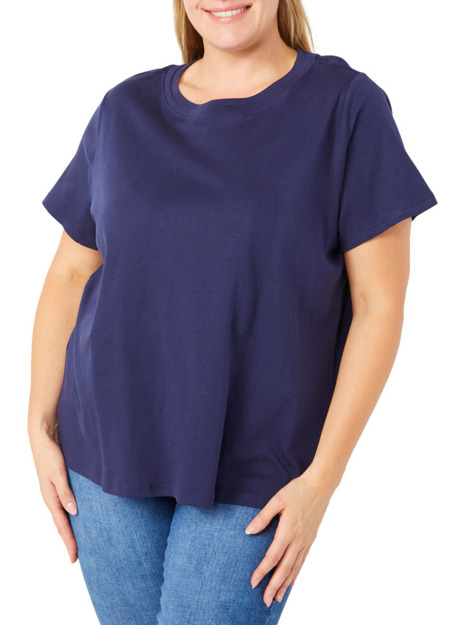 Keep it sleek and stylish with this Plus Double Band Scoop Neck Top. Featuring short sleeves and a flattering scoop neckline with double band detailing, this solid-colored essential adds a modern twist to your everyday wardrobe. Fabrication is 100% cotton. Measures approximately 30 inches.