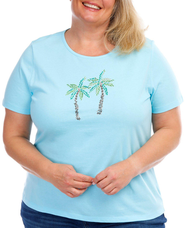 Unveil the essence of tropical elegance with our Plus Short Sleeve Embellished Tropical Palm Top. Made from a comfortable and breathable blend of 60% cotton and 40% polyester, this top promises all-day comfort with a soft touch against your skin.