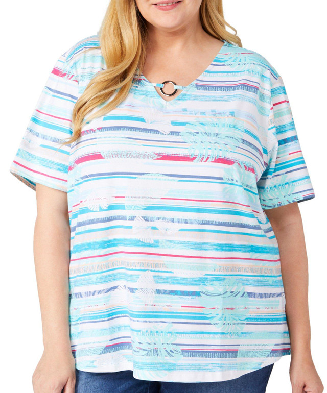 Add a touch of flair to your wardrobe with this Short Sleeve Print Tee. Featuring a stylish V-neck with an O-ring detail, this tee combines fashion and comfort effortlessly. The eye-catching print adds a unique touch, making it perfect for casual outings or special occasions. Fabrication is 95% cotton, 5% spandex.