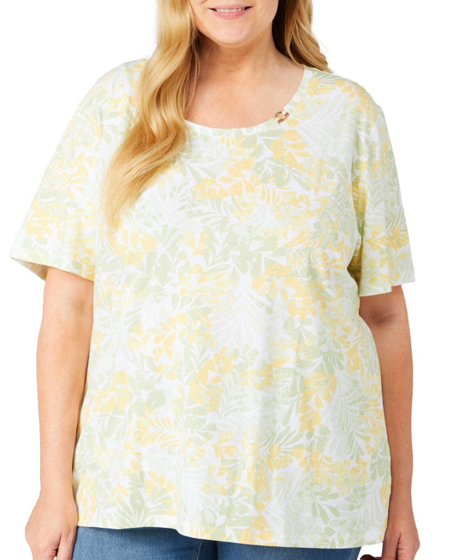 Embrace tropical vibes with the Plus Short Sleeve Palm Frond Print Tee. Crafted from a lightweight blend of 95% cotton and 5% spandex, this top offers a comfortable stretch that moves with you. Measuring approximately 24 inches in length, it provides a flattering fit that's perfect for pairing with your favorite casual pieces. The vibrant palm frond print adds a refreshing touch of nature-inspired elegance, making it a versatile and stylish addition to your wardrobe for sunny days and beyond.