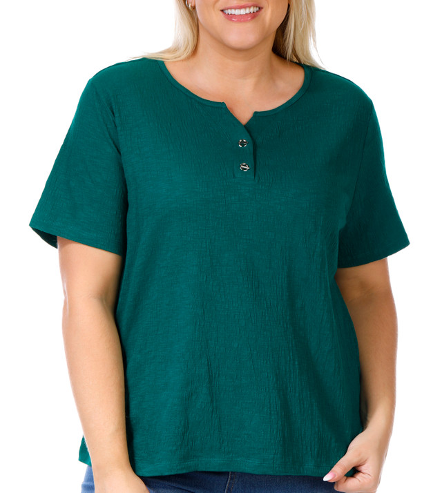 Add effortless style to your wardrobe with the Plus Solid Pucker V-Neck Grommet Henley Top, featuring a pucker textured fabric, V-neckline with grommet fasteners, and a touch of stretch for comfort and ease of movement. Perfect for casual outings, layering under jackets, or pairing with jeans and skirts for a versatile look. Fabrication is 96% cotton, 3% polyester, 1% spandex. Length measures approximately 27 in.