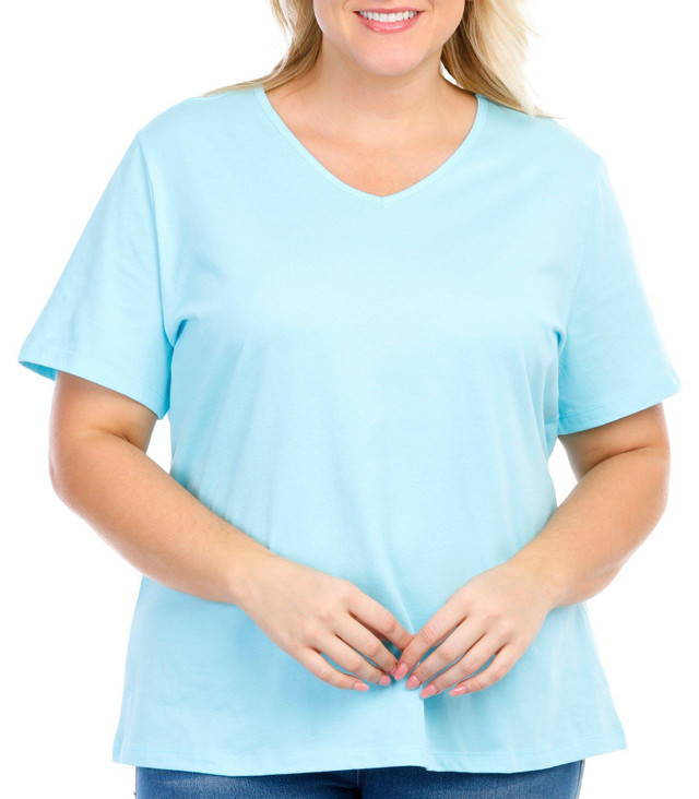 Add another stylish piece to your wardrobe with this top! This short sleeve top features a solid-color design on lightweight knit fabric, a V-neckline and a classic fit. The top length measures approximately 29 in.
