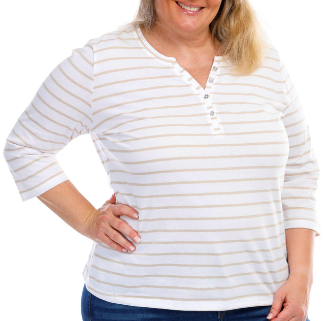 This ¾ sleeve top features a stripe pattern on lightweight fabric, four-button placket, and a straight hemline. The top length measures approximately 26 in. Fabrication is 60% cotton and 40% polyester.