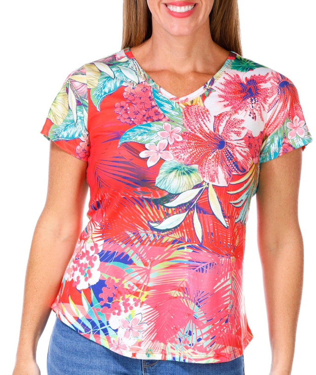 Brighten your wardrobe with the Women's Short Sleeve Hibiscus Print V-neck Top. Featuring a vibrant hibiscus print, flattering V-neckline, and sparkling rhinestone embellishments, this breezy short-sleeve top adds a touch of glam to your everyday look. Fabrication 95% polyester, 5% spandex