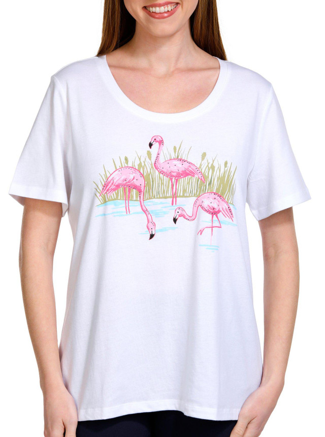 Add a splash of charm to your wardrobe with the Women's Embellished Flamingo Short Sleeve Top, designed with a playful yet sophisticated touch. Made from a soft and durable 60/40 cotton-polyester blend, this top offers the perfect combination of comfort and easy-care convenience. Its standout feature is the delightful embellished flamingo design that brings a pop of whimsy and fun to your look.