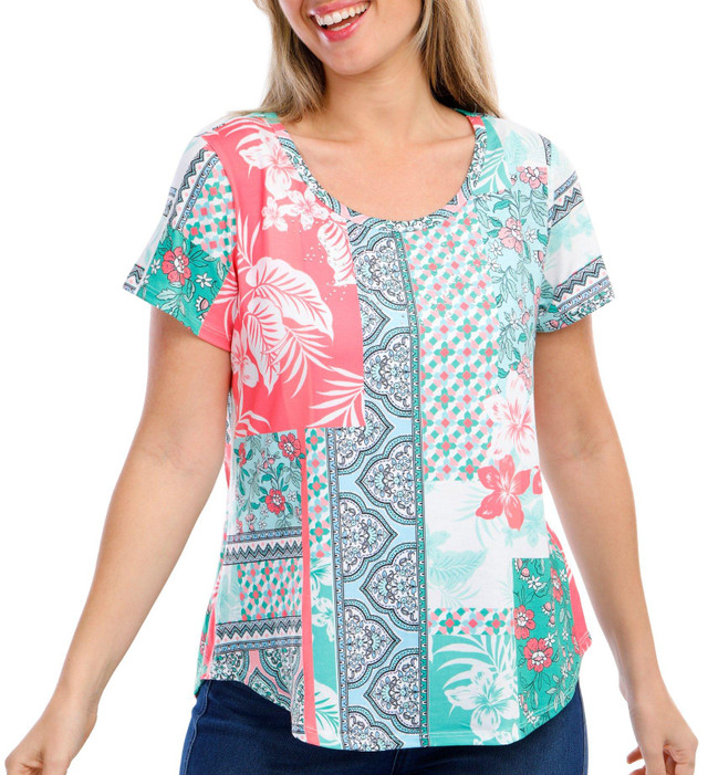 This womens embellished mixed print top is made from a soft blend of 95% polyester and 5% spandex, providing a comfortable, stretchy fit. Featuring a unique mix of prints, the top is accented with sparkling embellishments for added flair. Ideal for pairing with jeans or skirts, it offers a chic, casual look with a touch of elegance.